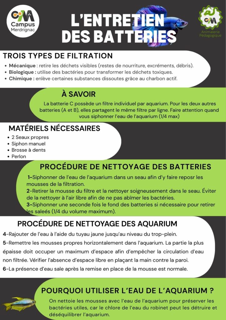 On y retrouve ensuite la liste du matériel nécessaire, suivie d’une procédure de nettoyage détaillée, expliquée étape par étape. Enfin, l’affiche explique l’importance d’utiliser l’eau de l’aquarium pour nettoyer les mousses afin de préserver les bactéries. L’ensemble comporte des images de poissons et utilise des couleurs vertes et noires dans le but de rester dans le thème du lycée.