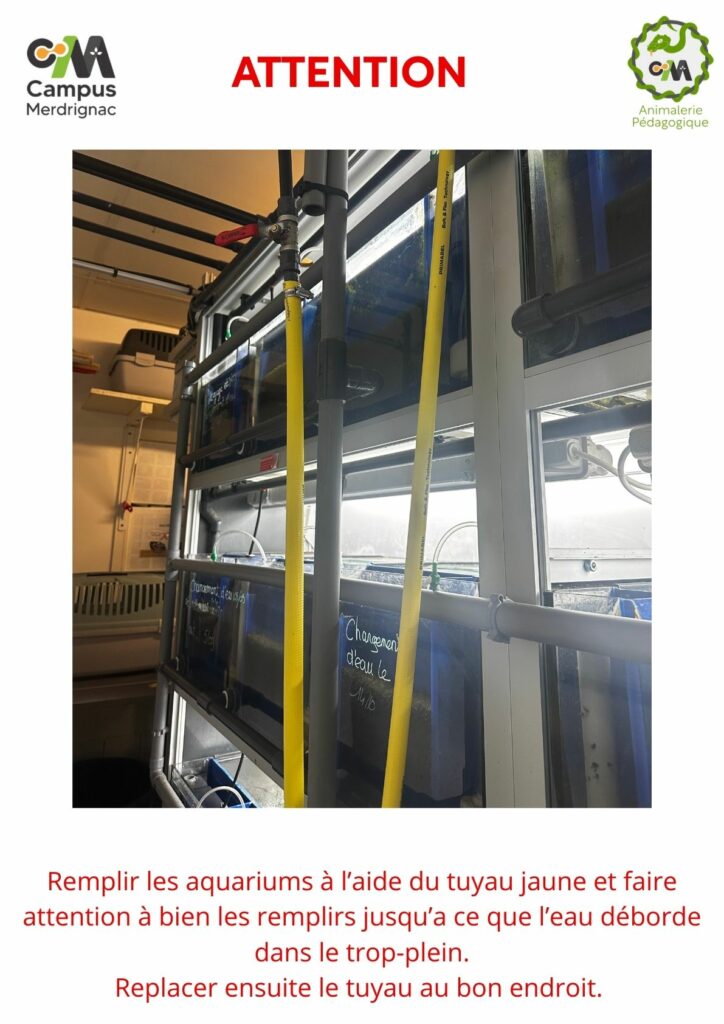 Le texte explique qu’il faut remplir les aquariums à l’aide du tuyau jaune jusqu’au niveau du trop-plein, en faisant attention au débordement. L’affiche vise à prévenir les erreurs et montre une photo réelle pour mieux comprendre.