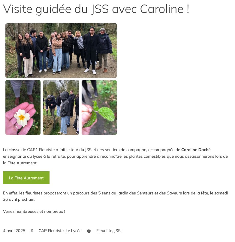 Ce projet consistait à réaliser une page sur le site du lycée pour les CAP Fleuriste sur la visite au JSS avec Caroline, une ancienne professeure pour la Fête Autrement.