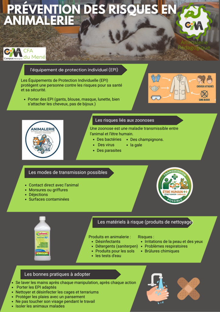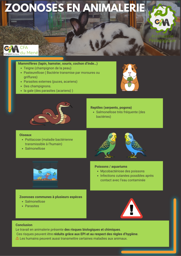 Pour conclure, ce projet m’a permis de développer mes connaissances sur les zoonoses et la prévention des risques en animalerie. J’ai également amélioré mes compétences en création d’affiches et en utilisation d’outils comme Canva.