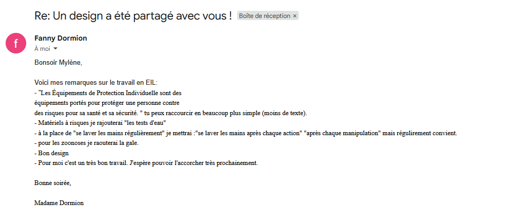 J’ai envoyé un mail à Madame Dormions, ma professeure d’animalerie, pour obtenir son avis sur mes recherches et mon affiche. J’ai ensuite amélioré mon travail en suivant ses conseils, et elle m’a dit que c’était un très bon travail.